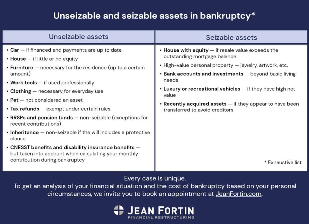 In the event of bankruptcy in Quebec, certain assets can be seized to repay creditors. As a general rule, only assets with sufficient resale value, namely those capable of generating liquidity and with high equity, are targeted. Here is an exhaustive list of assets generally considered seizable: